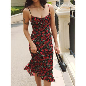 现货外贸亚马逊独立站跨境欧美夏女士浪漫玫瑰雪纺印花吊带连衣裙
