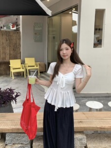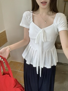 プラスサイズの太ったMMの甘い質感のスクエアネックトップは、蝶ネクタイ付きの右肩半袖Tシャツです