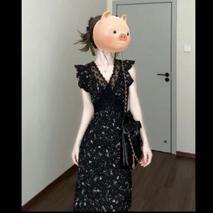 ブラックレースステッチ花柄ドレス、夏のリゾートスタイル、フレンチスタイル、ユニークで美しいバイアスカットウエストロングスカート