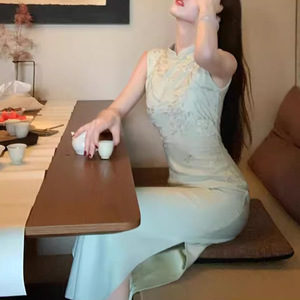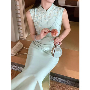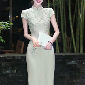 2025年夏緑刺繍中国風新中国風豆緑刺繍ドレスエレガントで美しい改良されたチャイナドレス