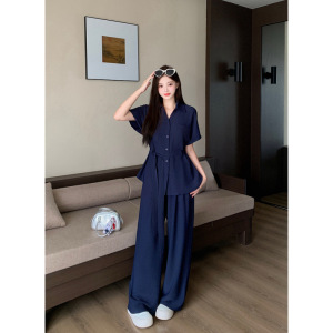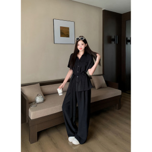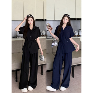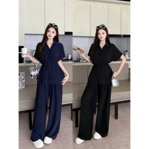 女装2025新款夏季胖mm大码女优雅气质绑带收腰衬衫上衣阔腿裤套装