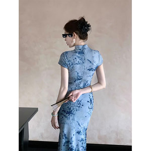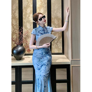 Lingqianzihe 雨の国風の新しい中国風の青い梅の花植毛チャイナドレス気質ハイエンドスリムチャイナドレス