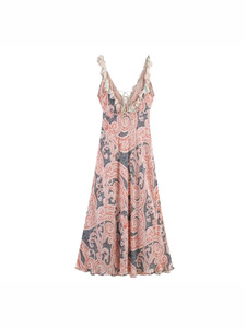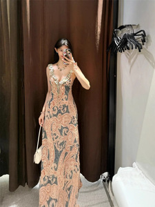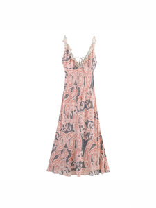 ZR レディース 外国貿易卸売 エレガントな気質プリント V ネック ノースリーブ ミドル丈 ミディ ドレス 3545575