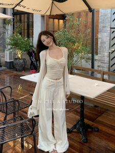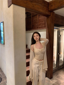 两件套夏女带胸垫吊带背心褶皱收腰扭结挂脖上衣防晒开衫休闲套装