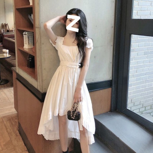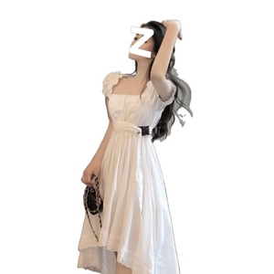 2025夏季新款法式复古方领裙收腰显瘦设计感白色短袖连衣裙女跨境