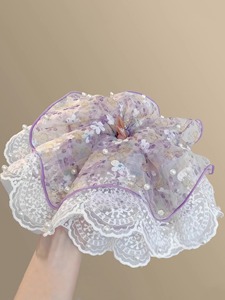 ミストヒヤシンス〜スーパーフェアリーラージふわふわ二層オーガンザイミテーションビーズヘアゴム刺繍ヘッドバンドヘッドアクセサリー