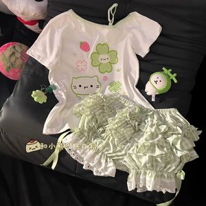 ツーピーススーツ 和風 かわいい 四つ葉のクローバー コントラストカラー オフショルダー 半袖トップス 夏 レースパンツ付き