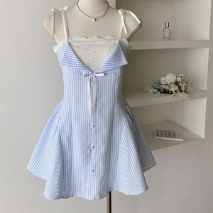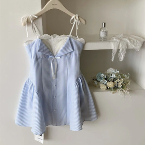 2025 春の新ストライプステッチ A ラインシャツスカートトレンディな春と夏のフレンチデザインサスペンダードレス女性のための