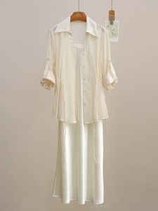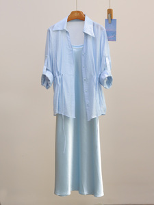 2025夏季法式粉色薄款天丝系带收腰防晒衬衫缎面吊带连衣裙两件套