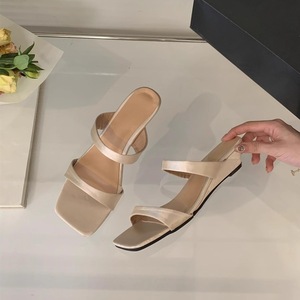 フレンチスタイルのサテンスクエアトゥオープントゥサンダル2025夏の新しいスタイルの女性用ウェッジヒールサンダル