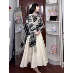 大码胖新中式水墨晕染披肩高级感吊带连衣裙富家千金感收腰长裙