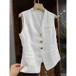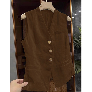 亚麻无袖西装马甲外套女春夏高端复古叠穿v领棉麻坎肩背心上衣秋