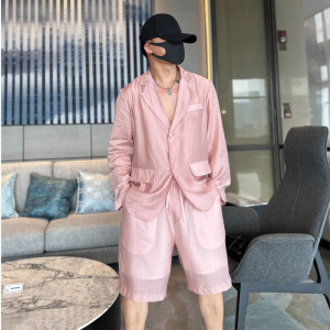 薄手の長袖シャツスーツメンズ夏のファッショントレンドルーズスーツカラーデザインシャツ+クォーターパンツ
