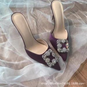 【在庫あり】春夏サンダル ラインストーン ポインテッドトゥ スクエアバックル バオトウ 浅口 細ヒール 美しいハイヒール セミスリップ サンダル レディース