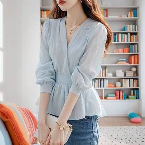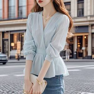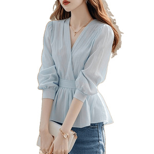 新しいトップウエストフレンチスタイルレースアップ2025春夏蓮の葉デザインストライプシャツシャツレディースアウター