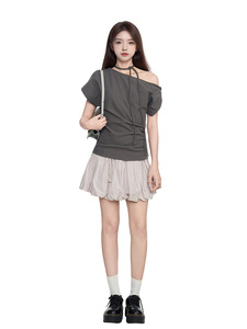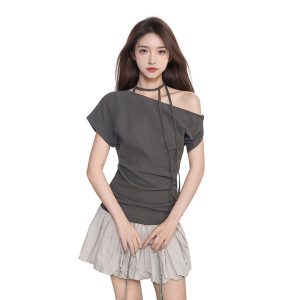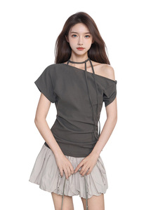 グレーの斜め肩ワンショルダーホルターネック半袖Tシャツレディース夏オフショルダースリムショートウエストピュアコットンショルダートップ
