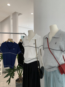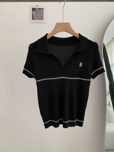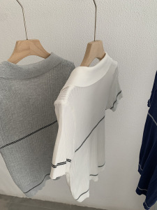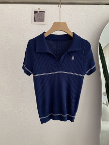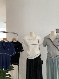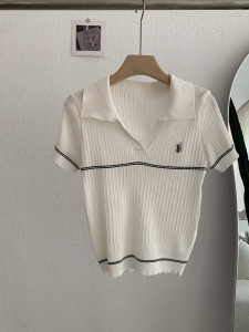 Omalai ラペルポニー刺繍柄コントラストカラー半袖セーターシンプルスタイル万能カジュアルトップス 3843