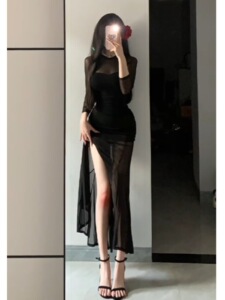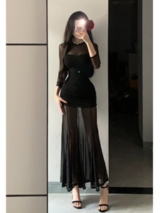 2025 春の新スタイルフレンチスタイルイブニングドレスセレブブラックメッシュ長袖ドレス女性のための