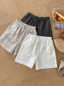 2025 夏弾性巾着斜めポケットハイウエストカジュアルパンツ多用途ルーズ痩身通気性リネン 100% ショーツ女性