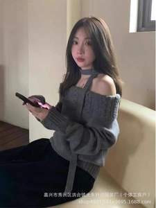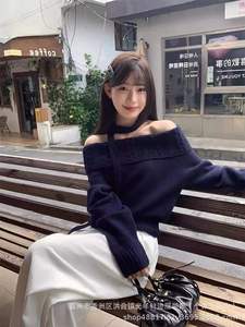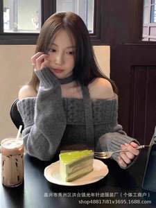 2025春秋新款韩系灰色一字肩毛衣少女感宽松外穿慵懒风漂亮针织衫