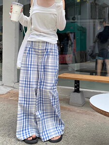 175高个子女生加长版慵懒松弛感宽松阔腿格子休闲裤女夏直筒垂感