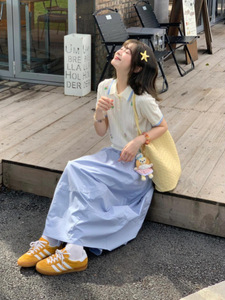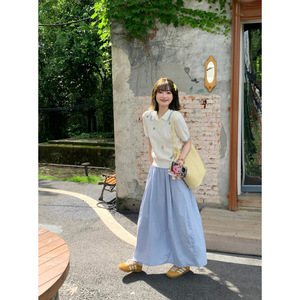 ドレスレディース2025夏新作着用年齢軽減ポロカラーセーターTシャツブルーロングスカート2点セット
