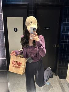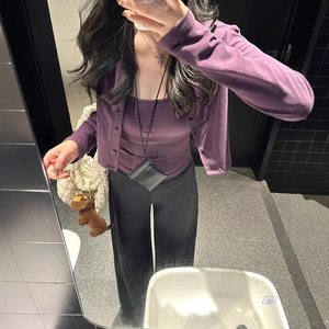 Pure Desire パープルサスペンダーカーディガンツーピーススーツ女性のための秋 2025 新しいスタイル甘いホットガールショート長袖トップ
