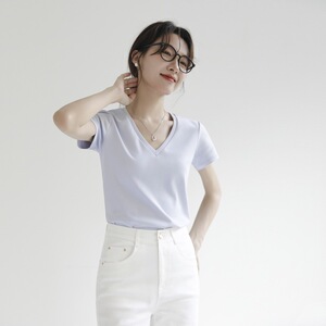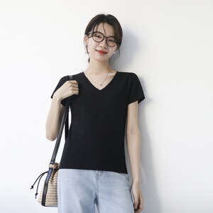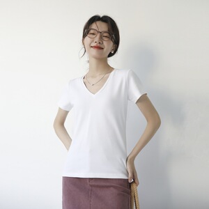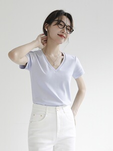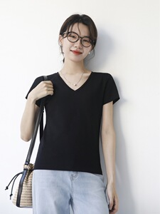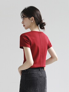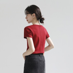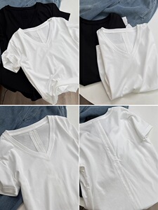 设计感反缝正肩V领短袖t恤女后背中线小众宽松显瘦极简上衣T恤衫