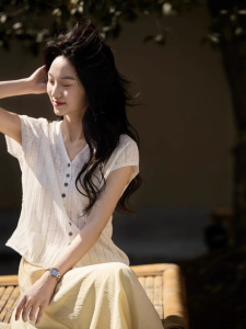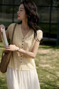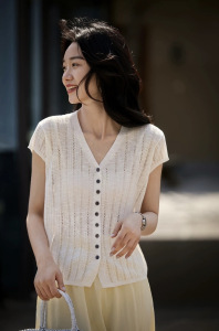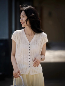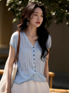 新款木扣镂空衫!萣织天丝亚麻镂空勾花V领针织薄短袖开衫25夏新