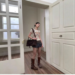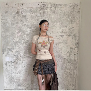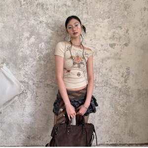 [260gレーヨンモーダル]ラブプリントスラントカラースリムTシャツレディースニューアメリカンホットガール半袖トップ