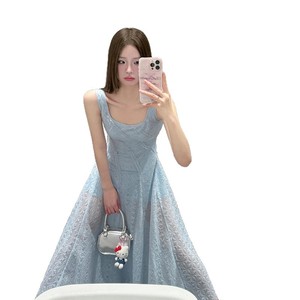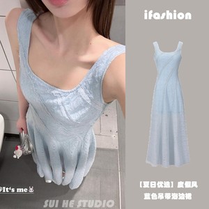 度假风天蓝色2025夏季穿搭肌理感收腰吊带长裙绝美掐腰海边连衣裙
