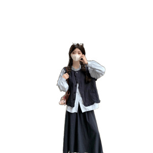 气质通勤套装茶系百搭马甲开衫叠穿长袖纽扣半身裙春秋女装三件套