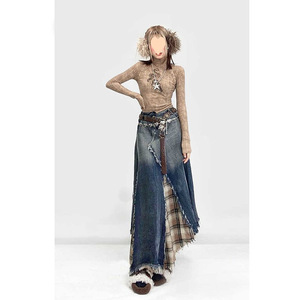 美式辣妹复古大码设计水洗不规则牛仔裙格纹拼接牛仔半身裙显瘦