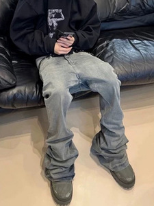 MIJKO メンズ レディース フレア スタッキング フロアレングス シワ加工 キャットウィスカー ジーンズ 男女兼用 マイクロ伸縮性 シワ加工 パンツ トレンド