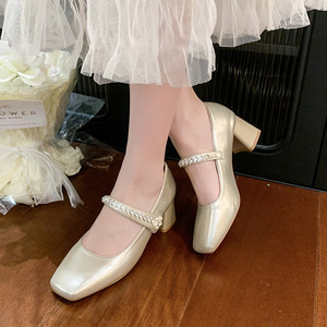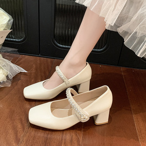 本革シルバーハイヒールレディース夏の新ファッションラインストーンメリージェーン浅い口スクエアトゥ太いヒール気質本革靴