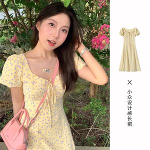 法式浪漫氛围感黄色碎花方领连衣裙女夏季设计感系带收腰显瘦长裙