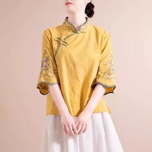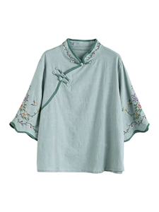 新しい中国風の夏の新しいスタイルの母親の刺繍入りボタン斜め襟ルーズティースーツトップシャツ中国風文学レトロ