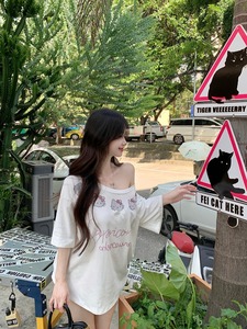 Thebestxue ルーススタイルオフショルダーホットダイヤモンドキティヘッドホワイト半袖 Tシャツレディースサマーオフショルダートップ