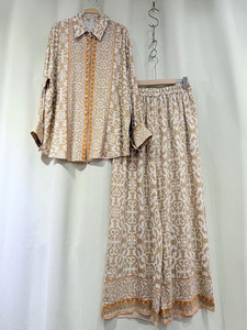 2025 外国貿易婦人服レトロ幾何学プリントラペルストレートシャツツーピース秋 + ルーズワイドレッグパンツセット