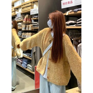 レイジースタイルソフトワックス状ラウンドネックイエローニットカーディガン女性のための春と秋のルーズ小森スタイルレトロセータージャケットトレンディ