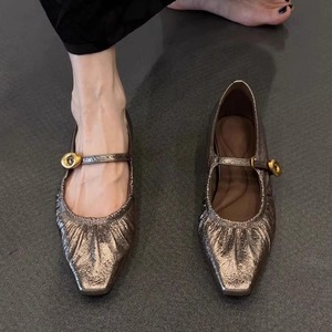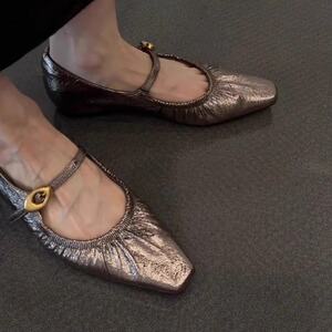 羊皮版~法式复古方头褶皱浅口单鞋女2025新款软底舒适一字带凉鞋