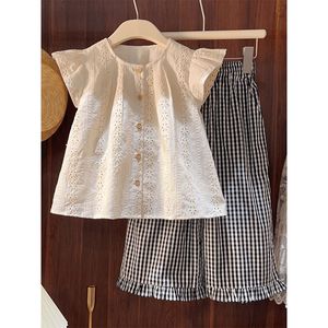 女の子中大子供夏スーツ2025新作おしゃれ半袖ドールシャツチェック柄おしゃれツーピースセット森ガール