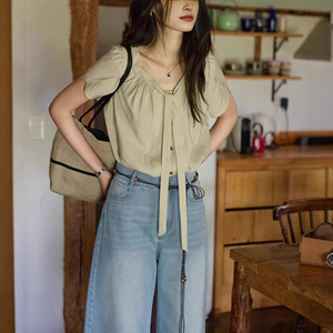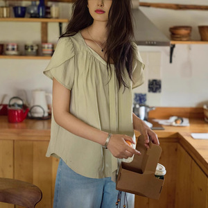 solighter フレンチリヨセルリボン花びら袖レディースサマーシャツ 2025 新しい V ネックドレープトップ