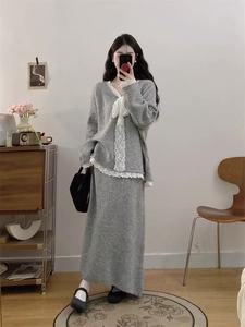 優しい気質スーツ女性の秋冬 2025 新しい V ネックプルオーバーセーター + ニットスカート無地 2 点セット