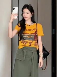オレンジプリントラウンドネックショルダー半袖Tシャツ女性用2025夏の新しいファッション年齢を減らすルーズスリミングトップ