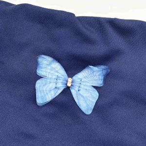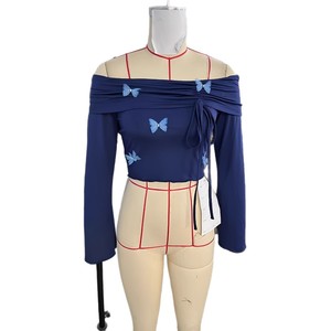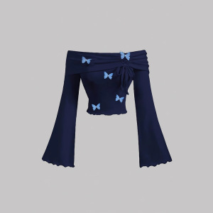 ヨーロッパとアメリカの国境を越えた売れ筋の女性用Tシャツ、新しいワンラインカラーオフショルダーのかわいい青い蝶のトランペット長袖トップス