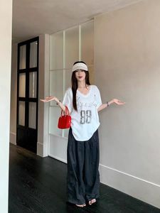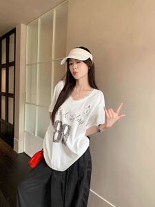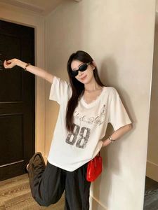 【自社工場在庫あり】アメリカンレイジースタイルレースステッチVネック半袖Tシャツルーズレタープリントトップス