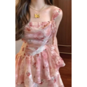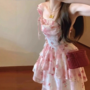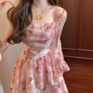 超仙气质唯美夏日度假风连衣裙粉色花朵不规则吊带裙小个子短裙子