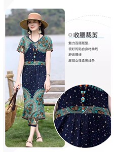2025 新しい夏の中高年女性のロング膝上スカートカジュアル半袖ママコットンシルクドレス