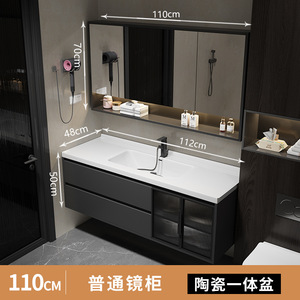 110cm アイアングレー スマート収納ミラーキャビネット 一体型セラミック洗面器